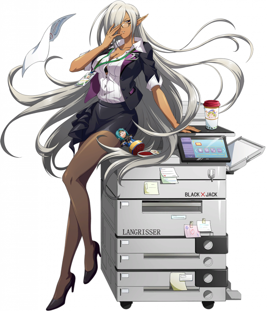 1girl adjusting_eyewear alustriel arm_support bespectacled black_bra black_shoes black_skirt blazer bra bra_peek breasts brown_eyes brown_pantyhose button_gap cleavage cup dark-skinned_female dark_elf dark_skin disposable_coffee_cup disposable_cup dress_shirt elf figure floating_hair floating_lanyard floating_paper full_body game_cg glasses grey_hair hair_over_one_eye high_heels id_card jacket langrisser langrisser_mobile lanyard large_breasts leaning leaning_on_object leg_up long_hair looking_at_viewer looking_over_eyewear miniskirt office_lady official_alternate_costume official_art open_clothes open_collar open_jacket pantyhose paper parted_lips partially_unbuttoned pencil_skirt photocopier pointy_ears pumps semi-rimless_eyewear shirt shoes short_sleeves simple_background skirt skirt_suit smile solo standing standing_on_one_leg striped_clothes striped_shirt suit tachi-e third-party_source transparent_background two-sided_fabric two-sided_jacket underwear vertical-striped_clothes vertical-striped_shirt very_long_hair white_shirt wing_collar rating:g parent:none source:https://patchwiki.biligame.com/images/langrisser/thumb/e/e3/av5i5lo07pfovfyo3r05autel9mcnmh.png/881px-立绘_职场妖精.png