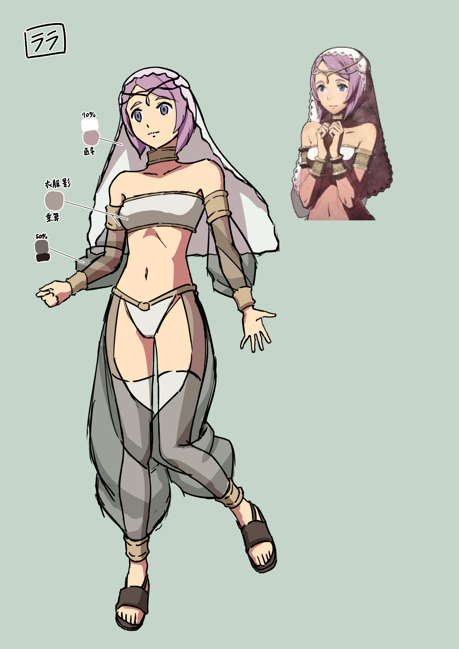 しかし、ララの姿を良く見てみると、FE覚醒の踊り子であるオリヴィエの衣装とよく似た格好をしている。よって、ララの下半身は、そのままオリヴィエの衣装にすれば違和感は無いという事になる。