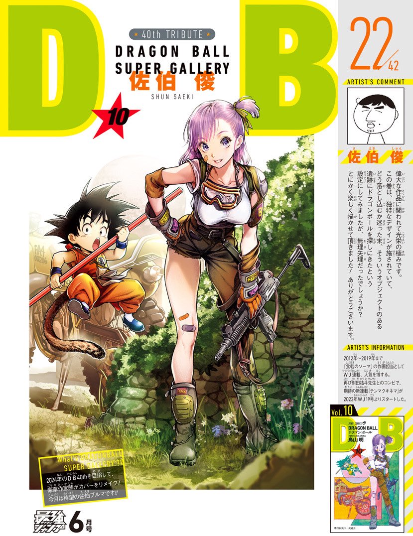 It’s the ultimate honor to be associated with such a legendary series. The cover of this volume has a very peculiar design, and after pondering about how to recreate it, I decided on a setting where Goku and Bulma come to look for a Dragon Ball on some ruins that just so happened to have objects shaped like the patterns from the original cover, but now I’m wondering if it was maybe a bit forced. Anyway, I gladly drew it and had a lot of fun doing it! Thank you so very much.