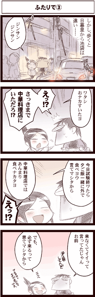 You're being contradictoryEh!?EheheTogether ③But it's far from Nippori to Ikebukuro...Jin-san, Jin-san.I'm hungry.Eh!?I want to eat something warm.Weren't you at the Chinese restaurant up until now?!so I didn't eat much at the Chinese restaurant.But I thought you'd definitely come.Didn't you tell me I didn't have to come?Because you said we should go out to dinner together if the exam ended today