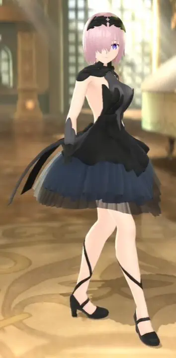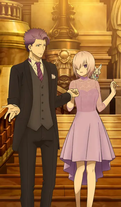 She is the first person the protagonist, Fujimaru Ritsuka, sees when he/she wakes up in Chaldea. She has short, purple hair which covers her right eye and purple eyes. When not in her servant form, she wears a necktie, black dress, jacket, black pantyhose and glasses. In her servant form, she wears an armored dress and carries an enormous shield, Lord Chaldeas (named by Olga Marie Animusphere). Later in the story it is revealed that the shield is in fact Lord Camelot, Galahad's Noble Phantasm.