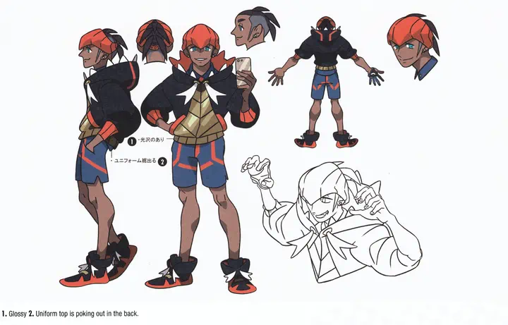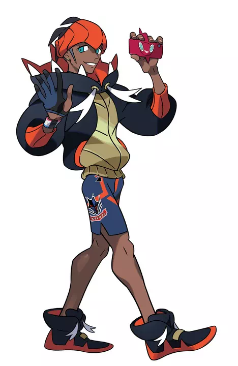 He has dark skin, droopy aqua eyes, and short undercut black hair. He wears an orange headband, earrings, a collared shirt under a black hoodie, a dynamax band, a glove, side slit shorts, and black shoes.