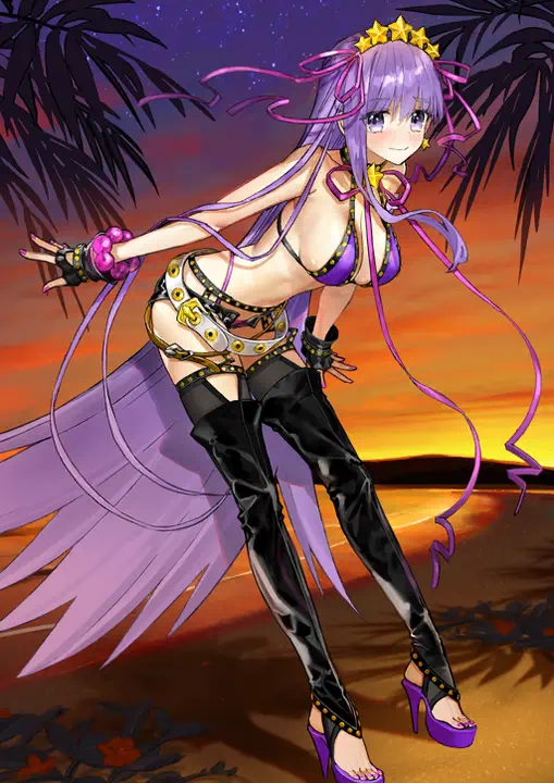 BB's Summer variant in her Second Ascension swimsuit from Fate/Grand Order. She wears a hairband with long purple ribbons and five stars adorning it, similar to the five stars seen on an SSR Servant's card. She wears another purple ribbon as a bowtie with a star decoration, a purple bikini, fingerless black gloves, a purple beaded bracelet, small black shorts, a white belt, black toeless thighhighs, and purple high heel sandals.