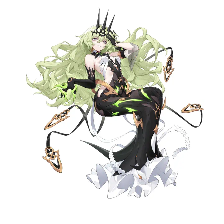 One of the Thirteen Flame-Chasers, codenamed Infinity. She is portrayed with long green hair, green eyes, and a prominent black tiara. Her default outfit consists of an ornate sleeveless black dress, multiple tassels, black elbow gloves with claws, and golden earrings.