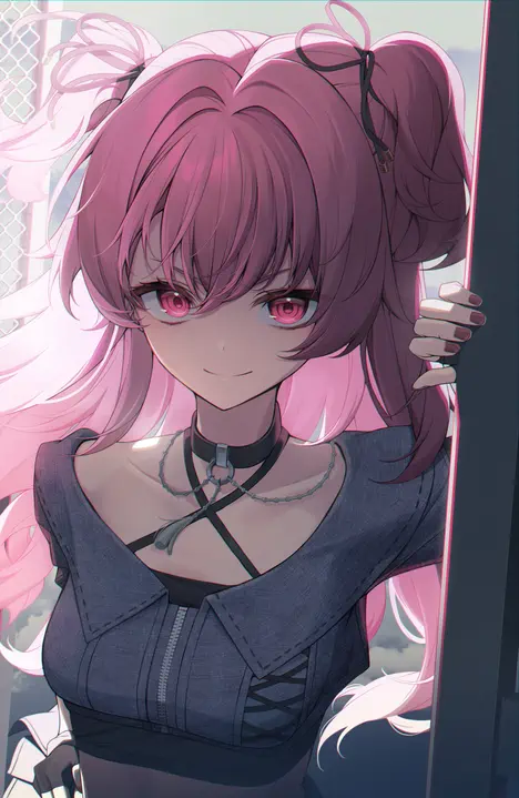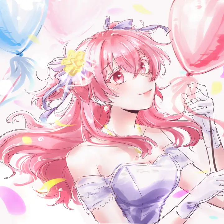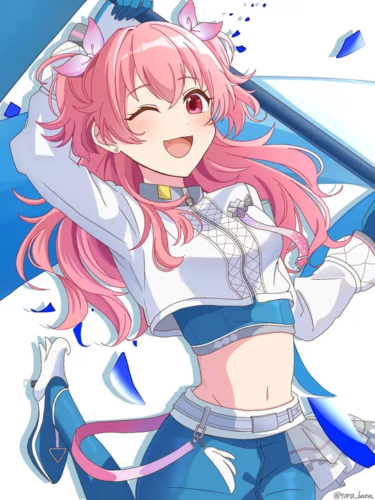 Airi has pink or red eyes and fluffy pink long hair that often tied into two side up.