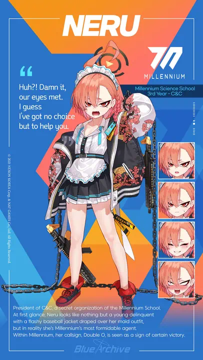 Character from Blue Archive. Leader of Millennium's Cleaning & Clearing. Callsign "Double Zero" (00). Her full name is Mikamo Neru.