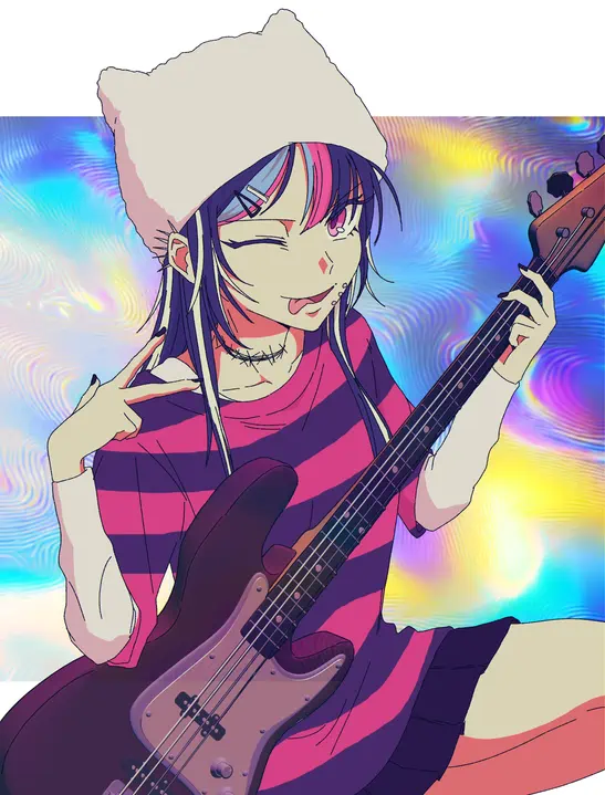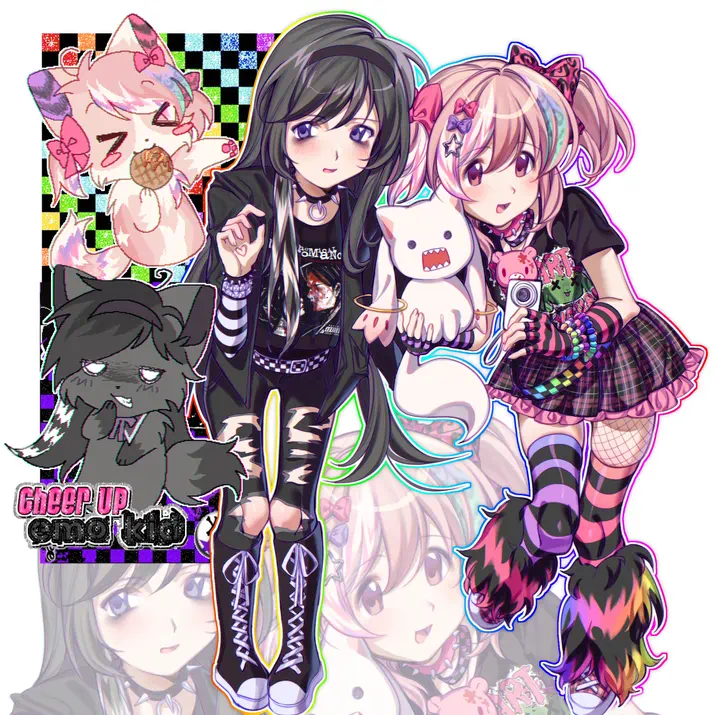 A fashion style similar to emo fashion, but more colorful and over the top. It features many accessories in bright colors, cartoon designs, patterns, and a focus on fluffy, colorful hair.