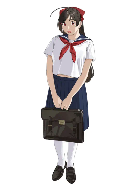 The school uniform with a sailor-style collar worn by Japanese schoolgirls in middle school and high school. The standard uniform consists of a white blouse, a pleated skirt, and a red neckerchief, but there are as many variations as there are stars in the sky.