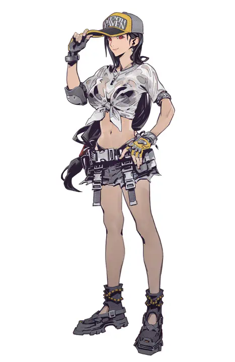 She has low-tied long black hair, red or brown eyes, and famously large breasts. Her typical attire is a white cropped tank top, a black skirt with suspenders, and black fingerless elbow gloves with a single elbow pad on her left arm. The remake adds a black undershirt and black shorts, as well as black thighhighs to her typical attire.