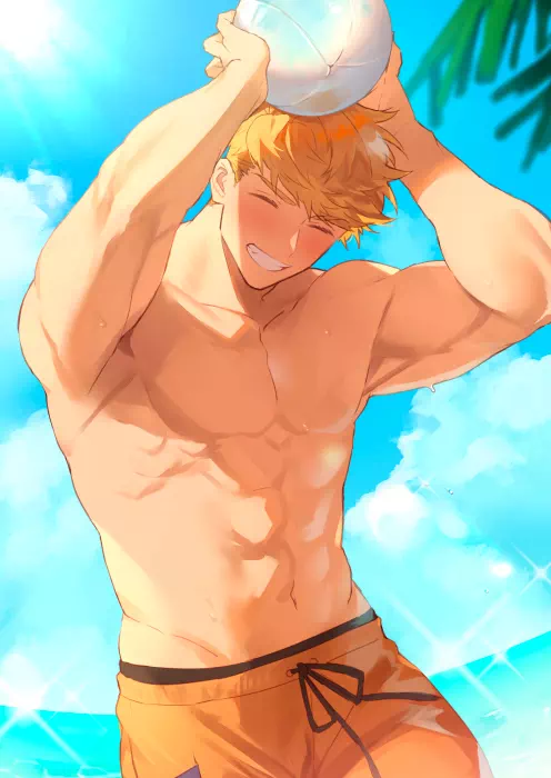 A muscular man with green eyes, blonde hair with bangs and undercut. He wields a large halbred as his weapon.