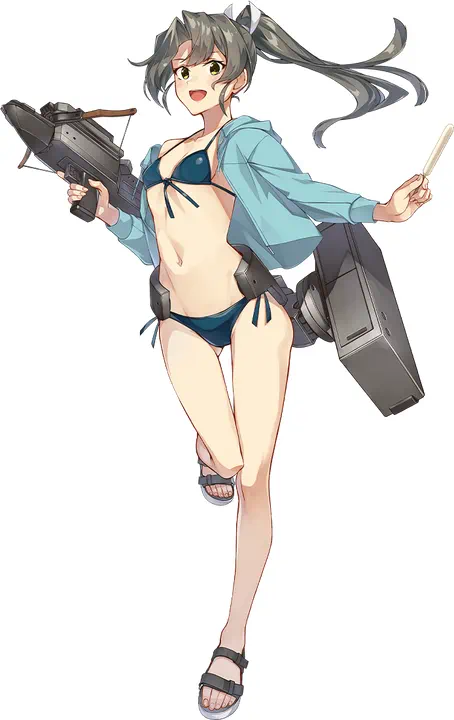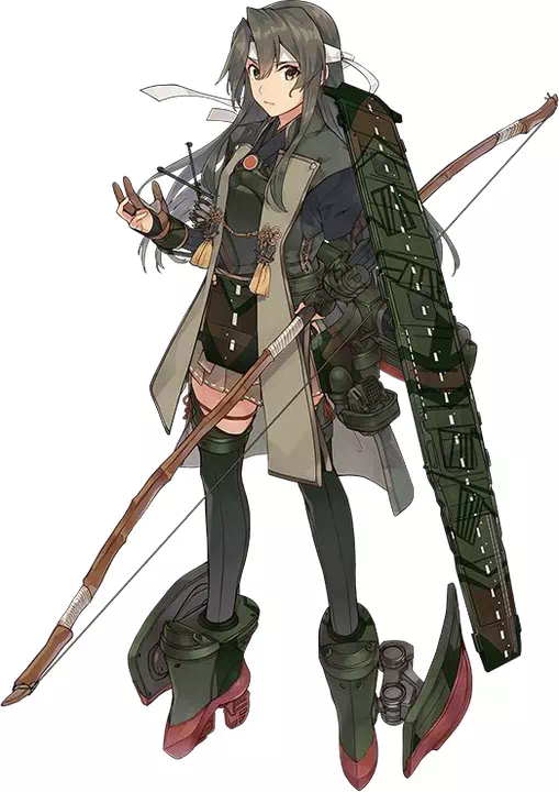 Her rigging consists of her flight deck on her left arm, her real-life hull to her back and used as a quiver, and multiple anti-aircraft gun placements on her waist and thigh boots.